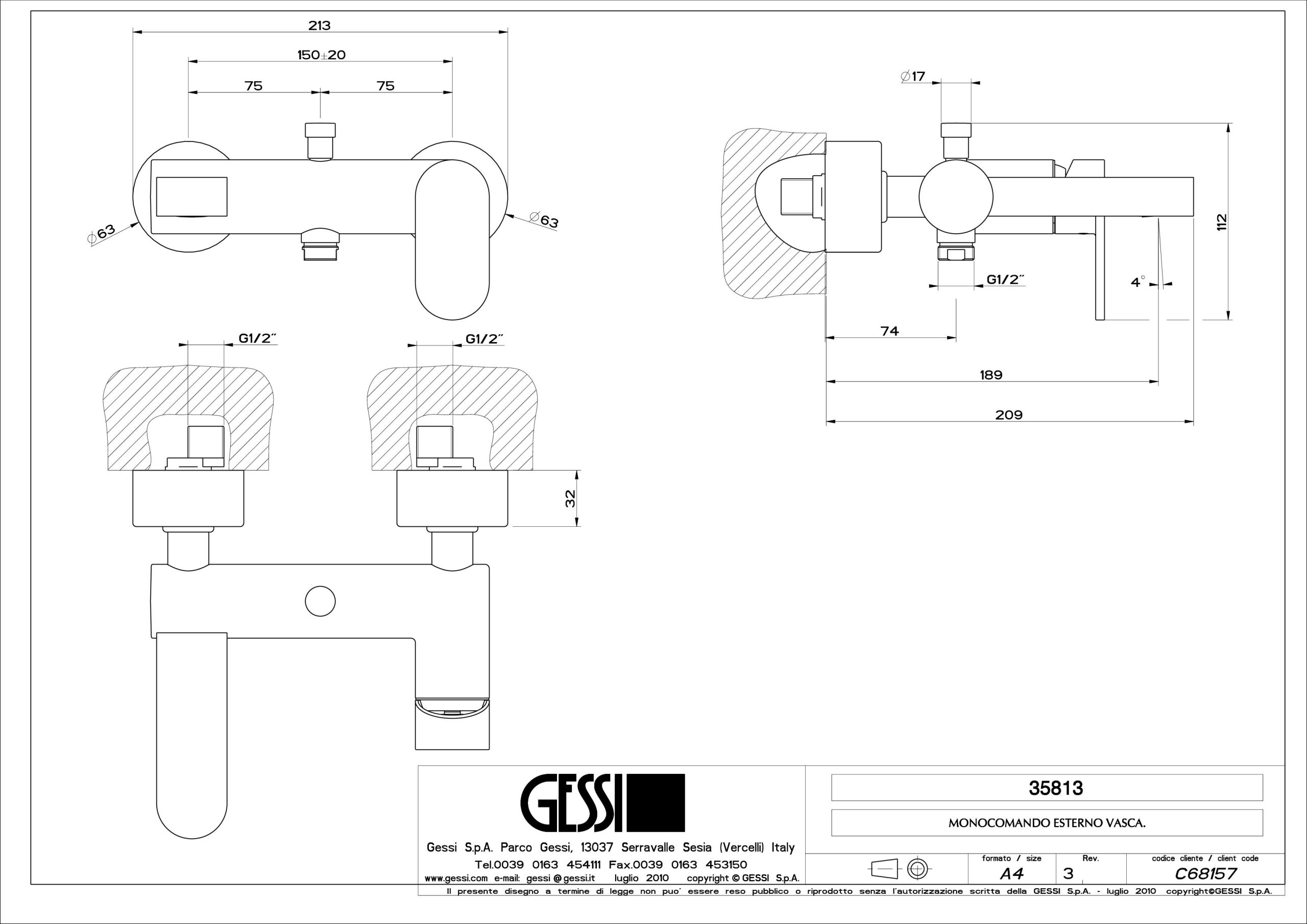 Ausladung (in mm): 212Gessi Corso Venezia Fertigmontageset für Unterputz-Badebatterie 1/2″