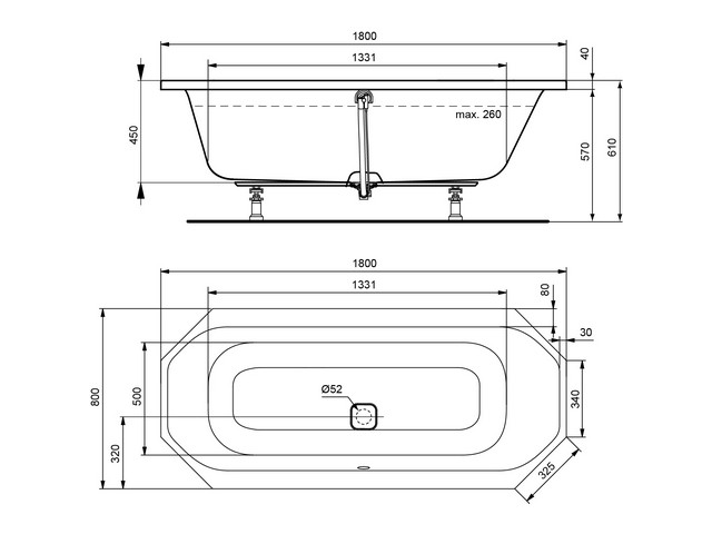 Datanormtext: – / –Ideal Standard Achteck-Badewanne TONIC II, m.Ablgarn.,m.Füller, 1800x800x490mm,Weiß